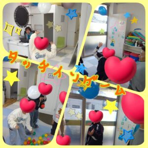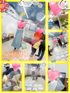 本日の2階のレクは、【羽子板バトル】をおこないました。2人1組のチームになり、1人5回ずつ床に設定された的目掛けて羽子板で風船を打ち点数を獲得してもらいます。