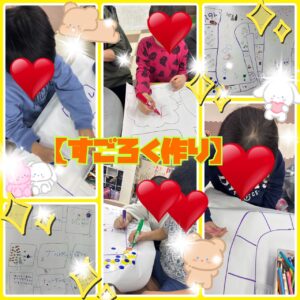 「どんなマスにする?」「ここに止まったら何する?」と子どもたち同士で相談しながら、意見を出し合い、内容を文字で書いたり、絵を描いたり、シールを貼ったりと、それぞれの個性がたっぷり詰まった作品が完成しました✨