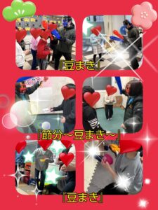 2月3日は『節分』です👹本日は、豆まきを行いました🥜お面を被った職員に「鬼は外.福は内」とかけ声をしながら豆まきをし、鬼を退治しました👹邪気を払い、福を招き入れ、健康で過ごせますようにと願いながら、みんなで楽しく取り組みました😄