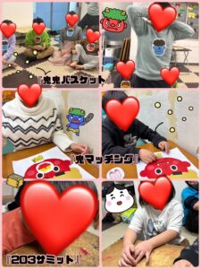 鬼のイラストに節分のイラストをマッチングさせるレクです「これかな…?」「こっちだ!」と考えながら楽しそうに挑戦した子どもたちでした☺️