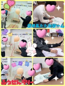本日のレクリエーションは、1階【服たたみゲーム】2階【ふうせんラリー】をそれぞれで行いました😊
