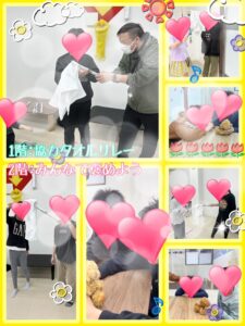 本日の1階のレクは、【協力タオルリレー】をおこないました。