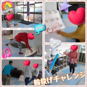なかなか的に入らず苦戦する姿もありましたがお友達の投げ方を見たり、職員から投げ方を教わり的に輪っかが入ると「やったー🤩入ったー🥳」と嬉しそうにする姿がありました😄⠀