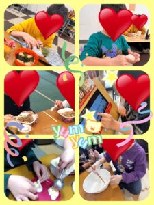 「美味しかった😊」や「上手にできた😊」など、みんなで美味しい雪見だいふくを作りました😊