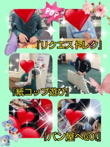 本日は『公園へGO!』の予定でしたが、雨天のため中止し、皆の希望で「紙コップ遊び」を行いました