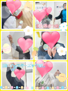 職員がお部屋の中にイースターエッグのイラストが描かれたカードを隠すので探してもらいました。