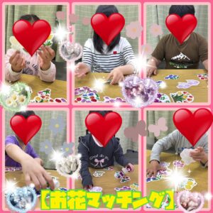 同じお花の絵を探して重ねる活動を通して、色や形の違いに注目しながら、楽しんで取り組む姿が見られました。