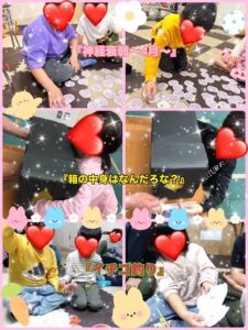 本日はトミカバージョンで行いました箱の中に救急車、消防車、バスなどのトミカを入れ、中のトミカを当てるレクです❗️回答する子は箱の側面に開けた穴から手を入れ、触った感触で中に入っているトミカを写真のリストから選んで答えてもらいます「なんだろう〜」「わかった❗️」とみんなで盛り上がりました