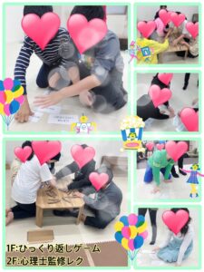 3人1組のチームになり、決められた秒数の間床に風船を落とさないように同じチームのお友達と協力してラリーしてもらいました🎈