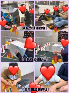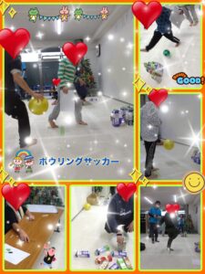 11/19(水)のプログラムは、ボウリングサッカーを行いました!2つに分かれて行い、倒すピンは10本ずつで足しか使ってはいけないというルールで行いました!最初から最後まで非常に盛り上がり、得点を記入してくれる子やピンを立て直してくれる子などそれぞれ役割を設定して行うことができました😊