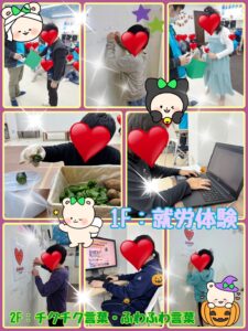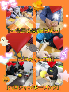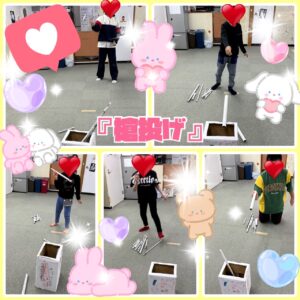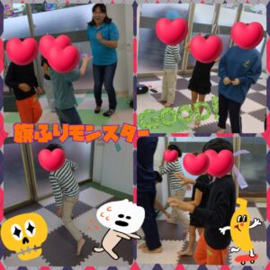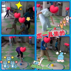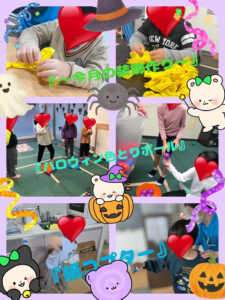 色々な色のボールを床に並べ指定した色のボールをGETしてハロウィンボックスに入れます2チームに分かれ指定された色のボールをチームで集めて合計数を競います段々ボールの数が減り、既に取り終わり床になくなった色の名前を言ってみたりと少し難易度を上げてチャレンジしました